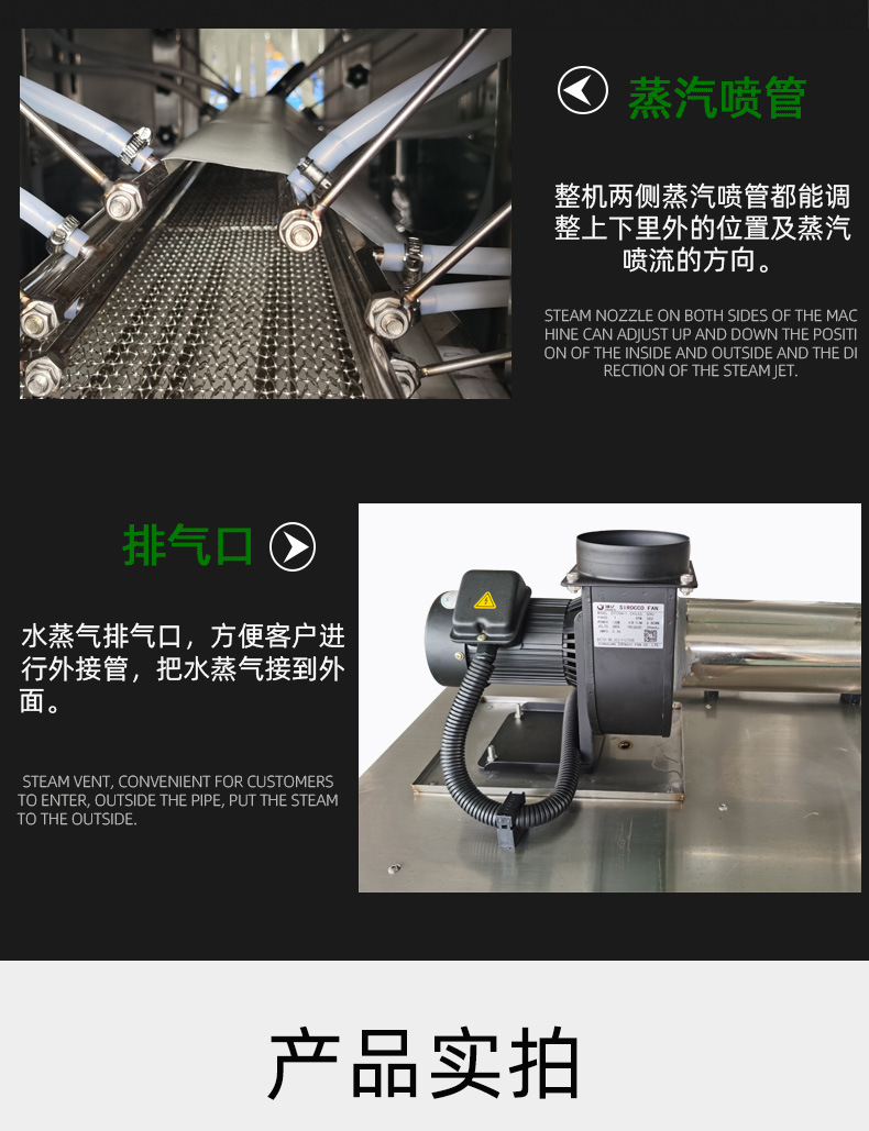 • 蒸汽噴射角度可調(diào)節(jié):整機兩側(cè)噴管每根都能調(diào)整其上下、里外位置及噴流方向,可根據(jù)產(chǎn)品的形狀、尺寸和包裝要求,精確調(diào)整蒸汽噴射角度,確保蒸汽能夠均勻地覆蓋在產(chǎn)品表面,進一步優(yōu)化收縮效果,同時降低瓶身受熱變形的可能135.