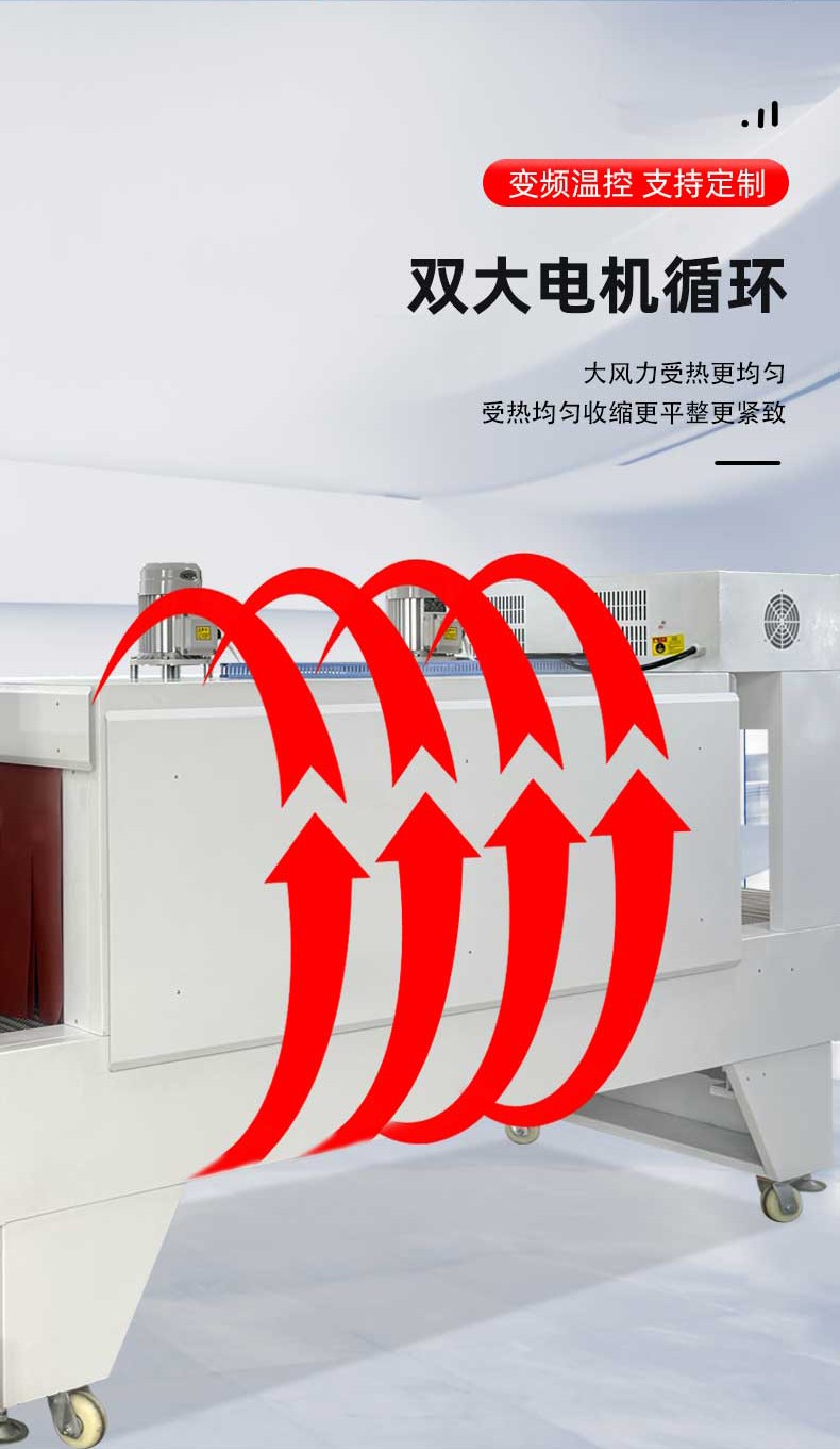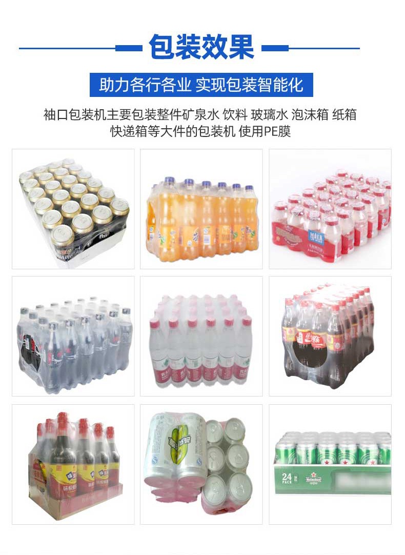 不同于傳統通用型包裝設備,袖口式熱收縮包裝機從設計源頭就瞄準 “瓶類產品組合包裝” 場景,徹底擺脫 “一機一用” 的局限。其針對瓶型包裝的特殊性,采用 “輸送帶 + 膜架 + 熱收縮通道” 的一體化結構:輸送帶可根據瓶身直徑、高度靈活調節寬度與輸送速度,無論是 500ml 的標準礦泉水瓶、1.2L 的果汁瓶,還是按壓式泵頭設計的洗手液瓶、帶提手的消毒液瓶,均能通過輸送帶平穩輸送且不偏移;膜架部分配備自動張力控制系統,可根據包裝膜厚度(常用 POF、PE 膜)精準調節出膜力度,避免因膜張力不均導致的包裝褶皺或破損;熱收縮通道則采用分區加熱設計,針對瓶身與組合間隙的不同熱收縮需求,實現均勻受熱,確保單瓶獨立包裝時膜面貼合瓶身,多瓶組合(如 2 瓶并排、4 瓶成箱、6 瓶堆疊)時膜體緊密包裹整體,杜絕 “局部收縮不到位” 的問題。