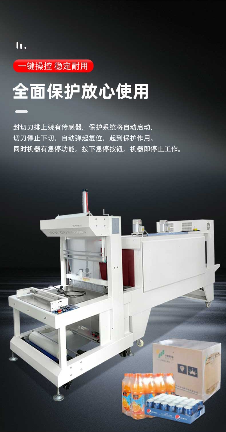 批量生產對設備的連續運行能力要求極高,袖口式熱收縮包裝機通過三大設計確保穩定性:其一,采用重型鋼結構機身,搭配精密軸承與耐磨輸送帶,長期運行后機身無明顯晃動,輸送帶磨損率降低 60%,使用壽命可達 3-5 年;其二,搭載進口 PLC 控制系統與伺服電機,核心部件故障率低于 0.3%,可支持 24 小時連續作業,即使在食品飲料行業 “旺季日產 10 萬瓶” 的高強度生產場景下,也能保持穩定運行;其三,配備完善的保護機制 —— 當加熱管溫度異常、包裝膜斷膜、輸送帶卡瓶時,設備會自動切斷電源或暫停運行,并在觸控屏上顯示故障原因,操作人員可快速排查維修,平均停機維修時間控制在 15 分鐘以內,大幅減少因設備故障導致的產能損失。