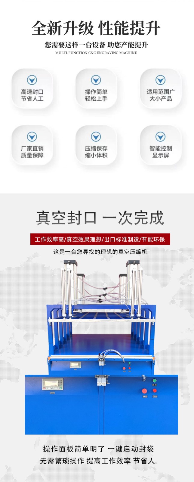 真空壓縮包裝機能大幅縮減產品體積,如紡織品、家居用品等蓬松商品經包裝后體積可減少 50% 以上