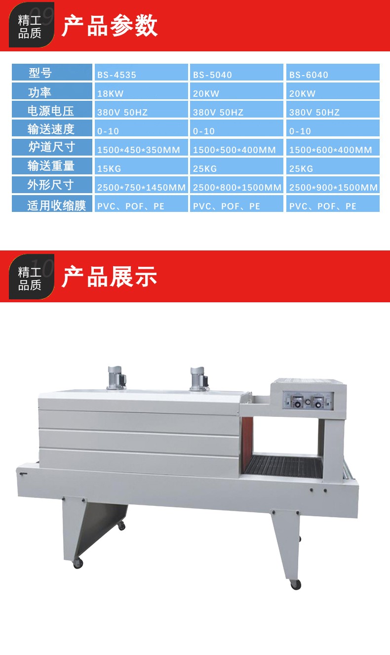 加熱系統是熱收縮機的核心部件。它主要由加熱元件(如石英加熱管或不銹鋼加熱管)和溫控裝置組成。石英加熱管升溫速度快,熱效率高;不銹鋼加熱管則具有使用壽命長等特點。溫控裝置可以根據不同的薄膜材料和包裝要求,精確地控制加熱溫度,一般溫度范圍可以從 100℃ - 300℃左右。