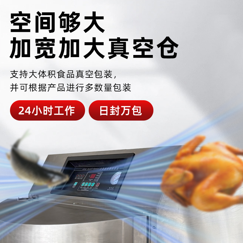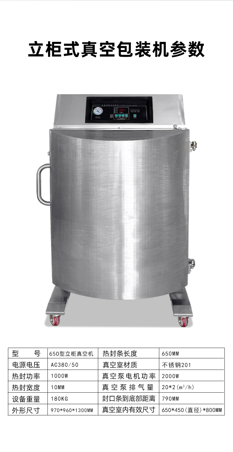 • 大容量真空室:立柜式真空包裝機的真空室容積較大,如 DZ-650L 型號,其熱封有效尺寸可達 650×8mm,可同時處理大批量食材或大尺寸包裝,能滿足整只火腿、海鮮禮盒、大桶粉末顆粒等特殊形狀物品的封裝需求49